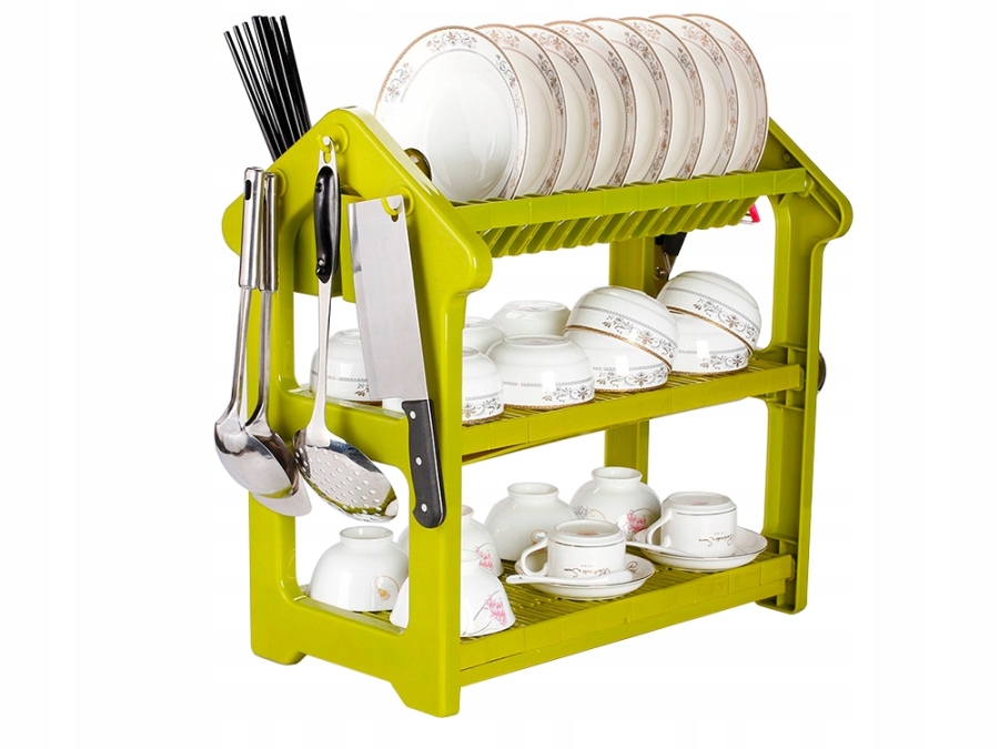 Odkapávač na nádobí je nezbytným vybavením každé kuchyně. Je velmi praktický, pojme velké množství talířů, misek a sklenic a má 3 patra. Je vybaven 6 háčky, na které můžeme zavěsit kuchyňské doplňky a nádobou se třemi přihrádkami na příbory.