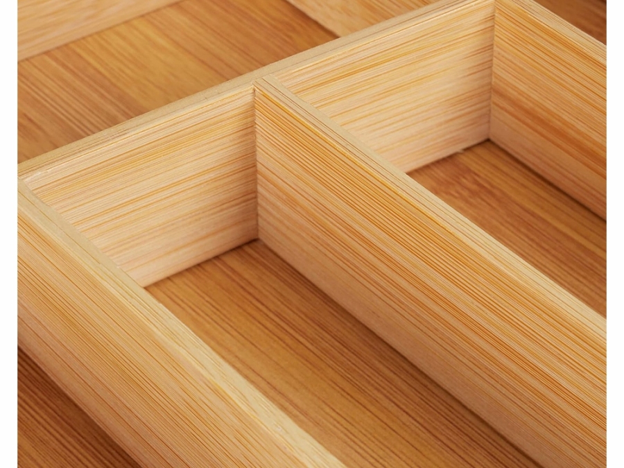 Bambusový organizér na příbory s 8 přihrádkami - ideální řešení pro ty, kteří chtějí mít v kuchyni pořádek bez kompromisů na estetice.