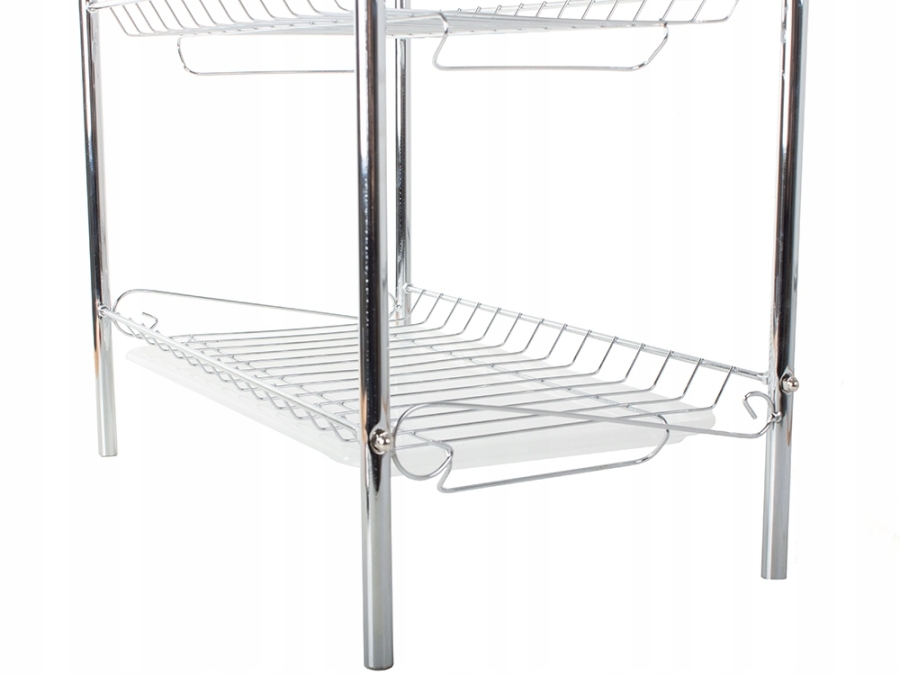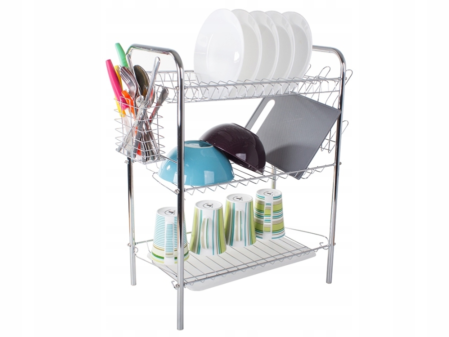 Třípatrový odkapávač nádobí je nezbytným vybavením každé kuchyně. Je velmi praktický, má tři úrovně pro umístění velkého množství talířů, misek a sklenic. Navíc má dva závěsné držáky. Jeden na příbory a jeden na prkénka.