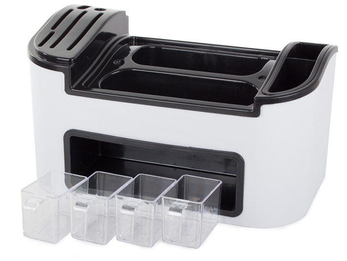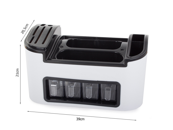 Na svrchní část organizéru můžete uložit často používané koření, sklenice, lahve a jiné. Na bočních stranách organizéru je velmi užitečné úložné místo příkladně pro velké kuchyňské nože, příbory a další kuchyňské náčiní. Ve spodní části organizéru jsou k dispozici čtyři prostorné zásuvky, do kterých můžeme uložit např. kávu, čaj, cukr atd. Zásuvky jsou vyrobeny z estetického, průhledného materiálu, takže vždy máte přehled kde co máte. Organizér se skládá z několika prvků. Každý z nich lze snadno vyjmout a důkladně umýt. Základna organizéru zároveň slouží jako odkapávač, díky kterému bude při vkládání mokrých příborů deska stolu suchá. Neváhejte a pořiďte si tento praktický organizér do vašich kuchyní.