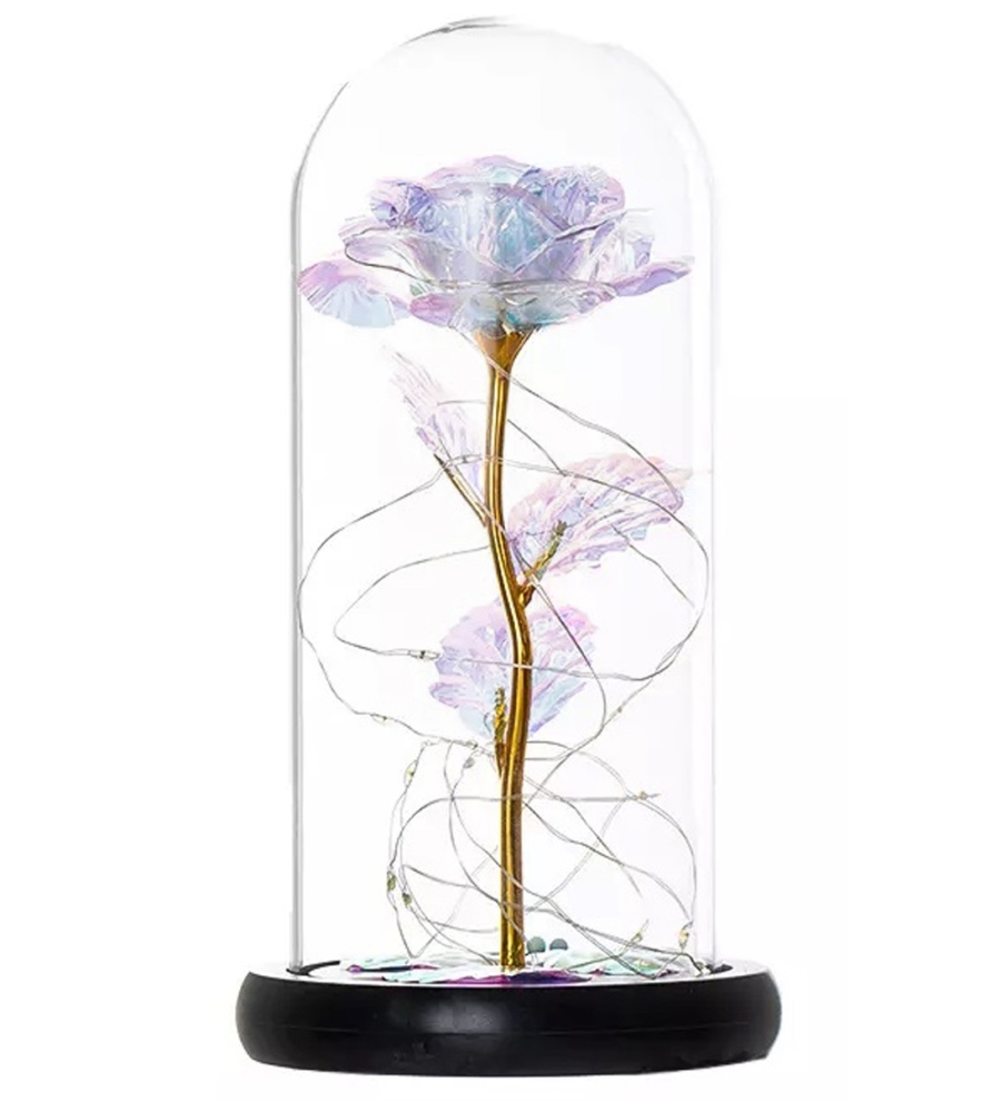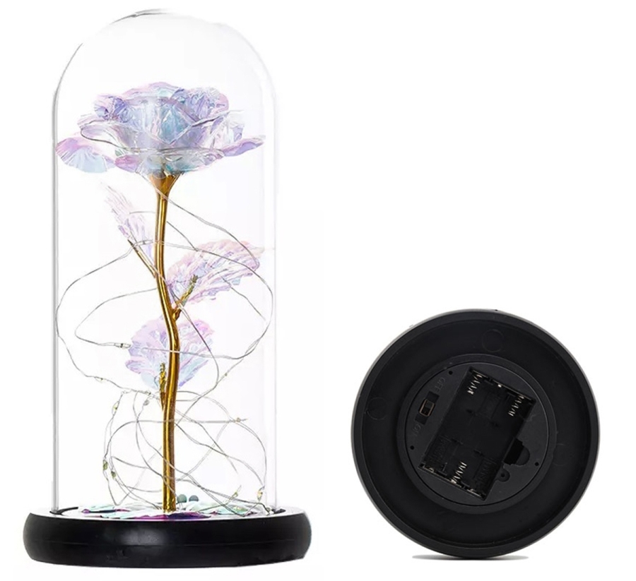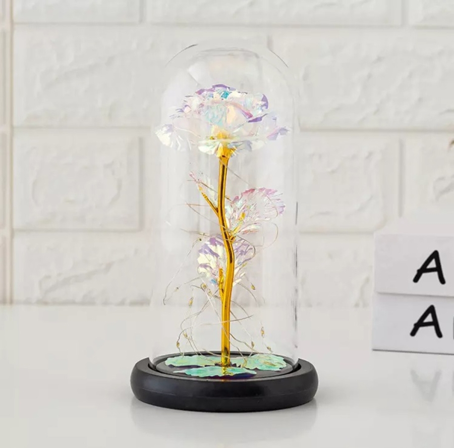Věčná růže umístěná ve skleněném stínítku. Díky dodatečnému RGB LED podsvícení vypadá růže skvěle i po setmění. Dodáváno s estetickou dárkovou krabičkou. Skvělý nápad na Valentýna, narozeniny nebo jako netradiční dárek. :)