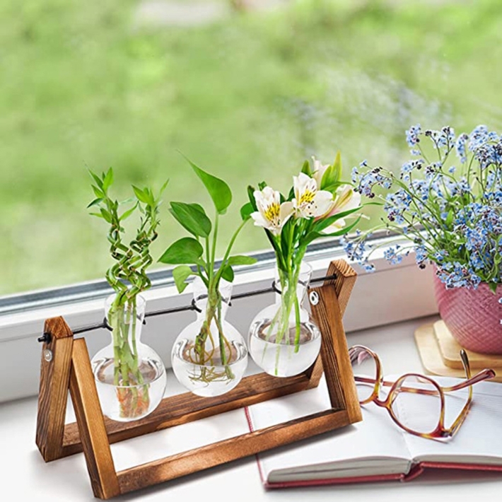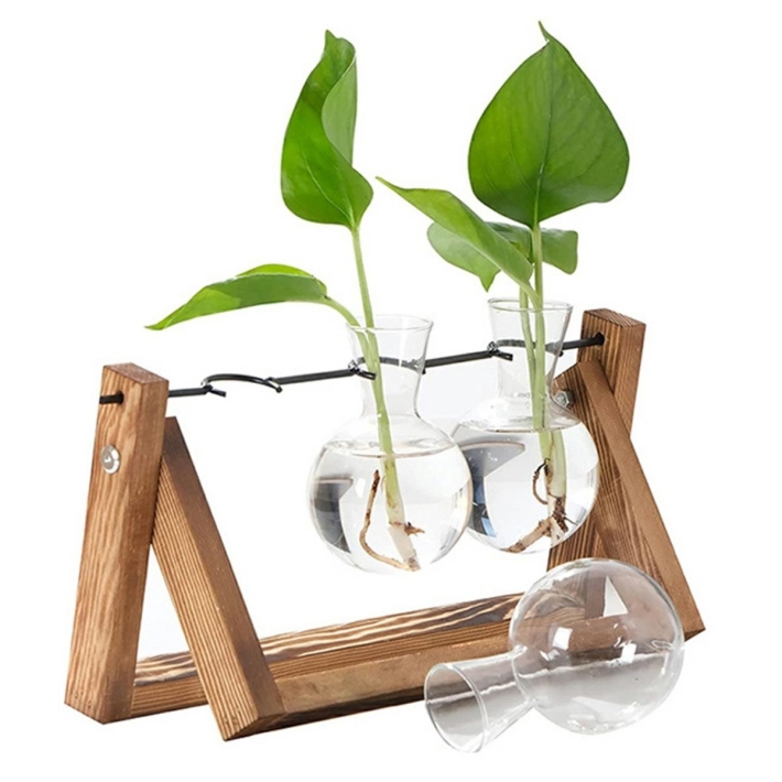 Tato hydroponická váza se třemi skleněnými nádobami je Ideální pro domácí pěstování květin a bylinek. Hydroponická technika je kultivace bez půdy za použití vody a roztoků minerálních solí, které umožňují rostlinám růst bez použití půdy. Váza disponuje estetickým, dřevěným stojanem o rozměru 27,7 cm x 14 cm a 3mi skleněnými nádobami o rozměru 10 cm x 6,5 cm. Námi nabízená váza se skvěle bude hodit jako vnitřní dekorace, která ukáže celý kořenový systém rostlin.