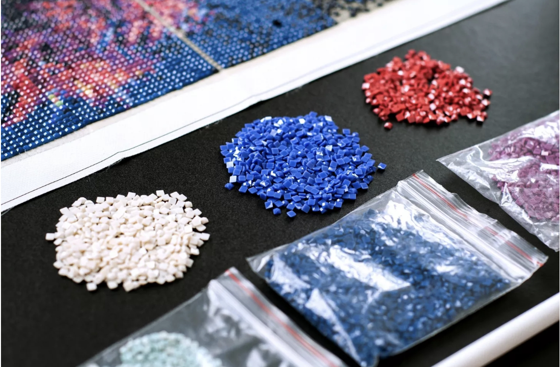 - diamanty různých barev, které jsou roztříděny do očíslovaných sáčků označených příslušnými symboly