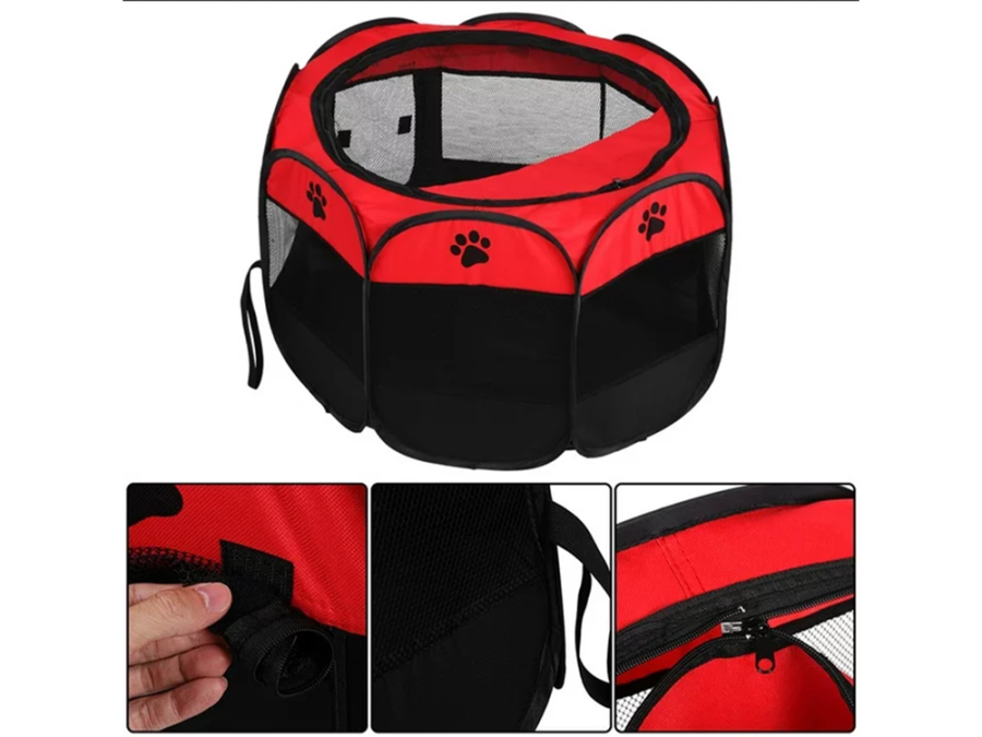 Skládací ohrádka pro Vašeho mazlíčka. Je to nejen pro Vašeho domácího mazlíčka, ale také také pohodlné a bezpečné řešení zejména při cestování nebo návštěvě venku. Je to ideální řešení pro velkou skupinu štěňat. Vyhneme se nejen nepořádku v domácnosti, ale také zbytečným překvapením v podobě rozkousaných věcí nebo vyřešení fiziologických potřeb. Ohrádka má otevírací vchod. Klopačku lze připevnit suchým zipem. Stříšku lze zapnout na zip nebo zcela odepnout.