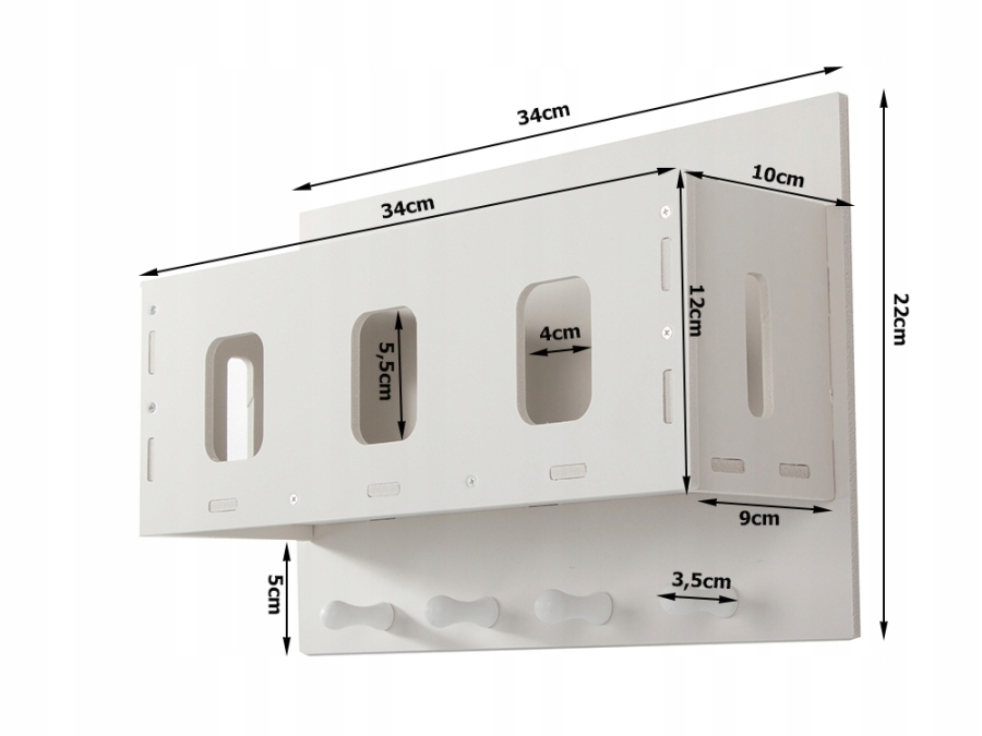 Závěsná police s odlehčenou konstrukcí z plastu (stlačená pěna) se osvědčí v každé koupelně, kuchyni apod. Můžete do ní uložit nezbytné, lehké koupelnové doplňky a na háčky pověsit ručníky, flanely nebo ubrousky.