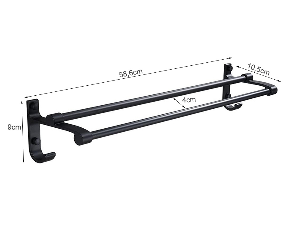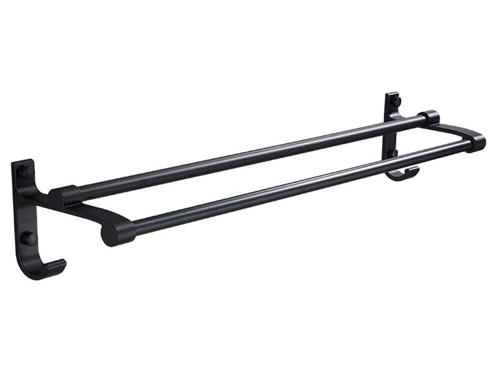Dvojitý držák na ručníky je praktickým a stylovým řešením pro pohodlné uložení ručníků v koupelně. Věšák se skládá ze dvou rovnoběžných tyčí, které lze připevnit na zeď.