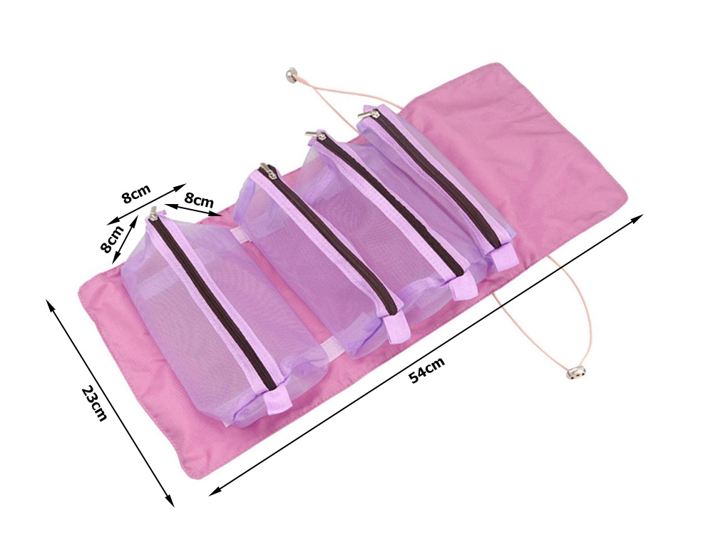 Organizér má 4 prostorné sáčky na líčidla, každý z nich je připevněn suchým zipem. Lze je vyjmout a přeskládat do libovolné polohy.