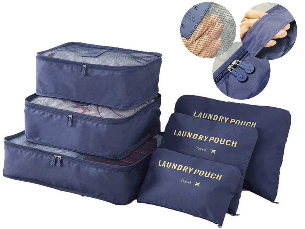 Sada šesti cestovních organizérů, které se skvěle hodí na zabalení všech potřebných věcí, jako je spodní prádlo, boty, oblečení nebo kosmetika , a na uložení prádla k vyprání.