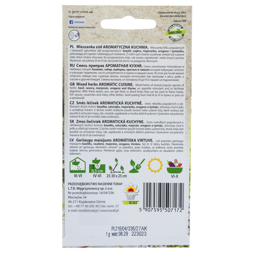 Směs několika populárních a oblíbených druhů bylinek: bazalka, majoránka, tymián, oregáno a kmín, které podporují chuť k jídlu a usnadňují trávení. Z těchto rostlin lze získávat čerstvé nebo sušené bylinky, které se používají k ochucení masa, ryb, omáček, zapečených jídel a dalších pokrmů. Sázíme je od poloviny března do června do truhlíků nebo květináčů na okenní parapet.