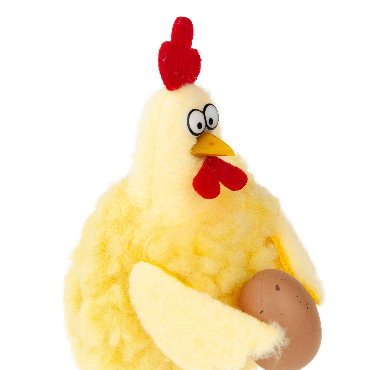 Žluté kuřátko držící vejce přitahuje pozornost svým vzhledem. Skvěle se hodí jako ozdoba velikonočního košíčku, aranžmá nebo jiné jarní či velikonoční kompozice. Vše záleží na vaší fantazii!