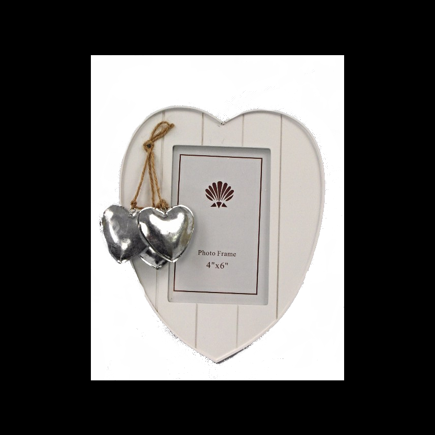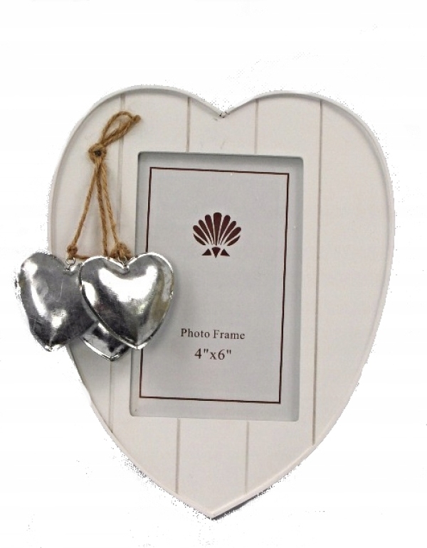 Bílý rámeček na fotografii 10x15 cm se stojanem, zdobený závěsným dekorativním prvkem ve tvaru tří kovových srdcí.
