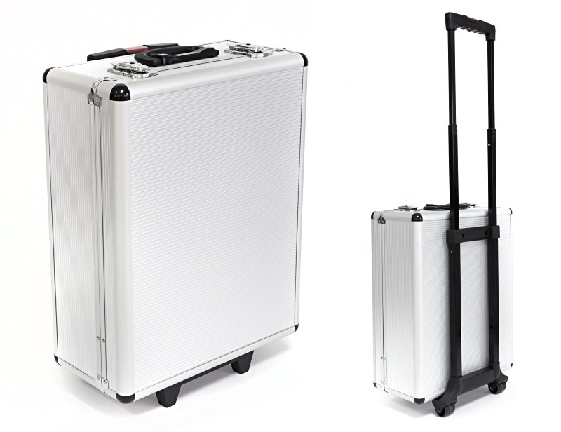 - Hliníkový kufr je vybaven kolečky a teleskopickou rukojetí pro snadnou přepravu (jako cestovní kufr). Lze jej bezpečně uzamknout přiloženým klíčem.