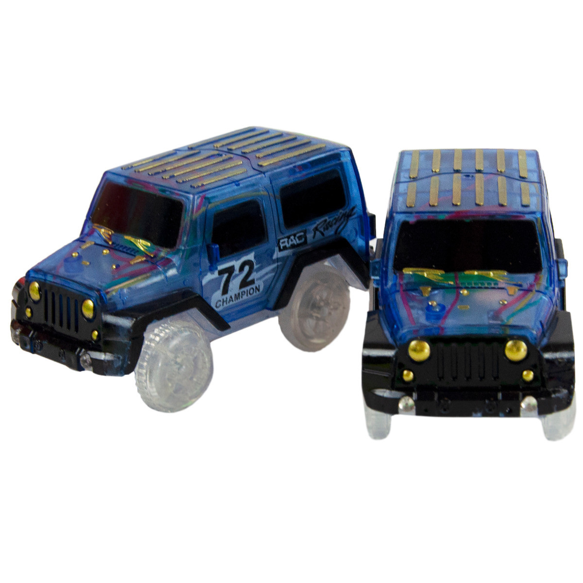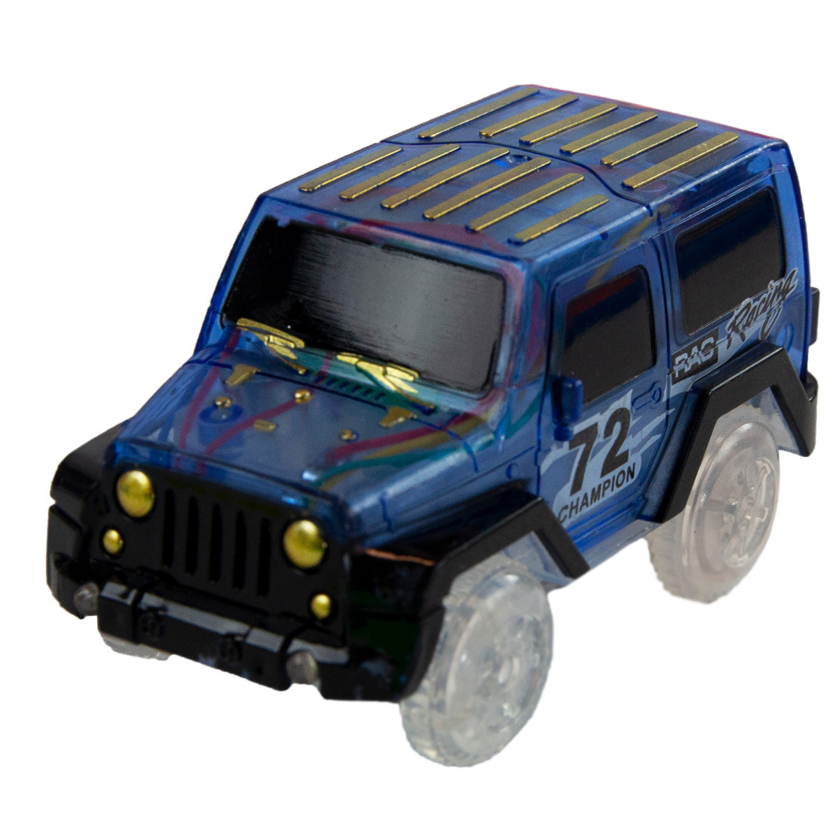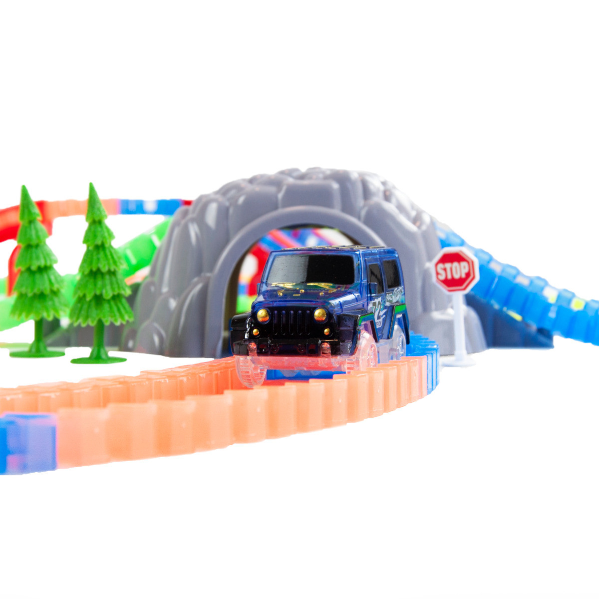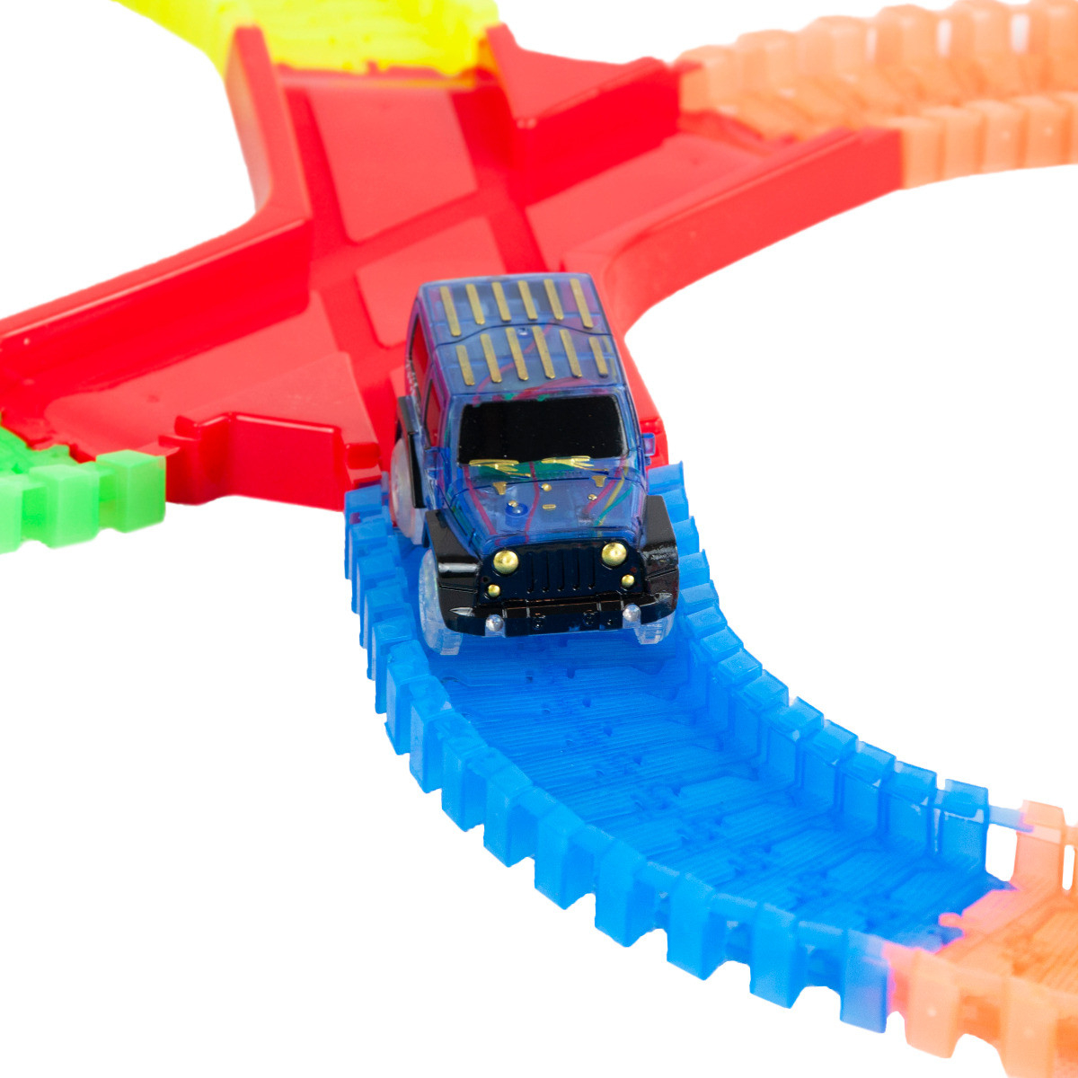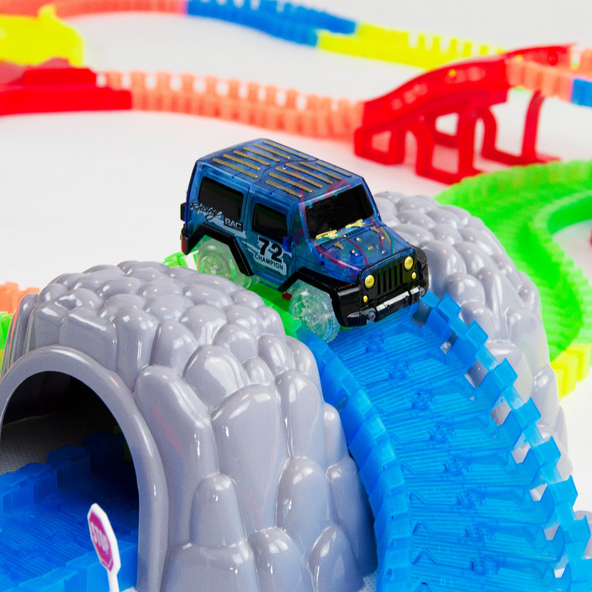 Součástí Magic Tracks je autíčko poháněné standardními bateriemi AA. Na začátku hry ho můžete ozdobit samolepkami. Autíčko je vybaveno 5 LED diodami, které vytvářejí úchvatný efekt při jízdě ve tmě. Je pevně postavené, takže nevypadne z dráhy.