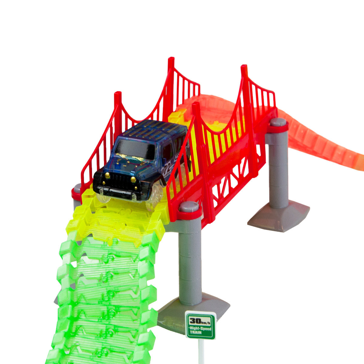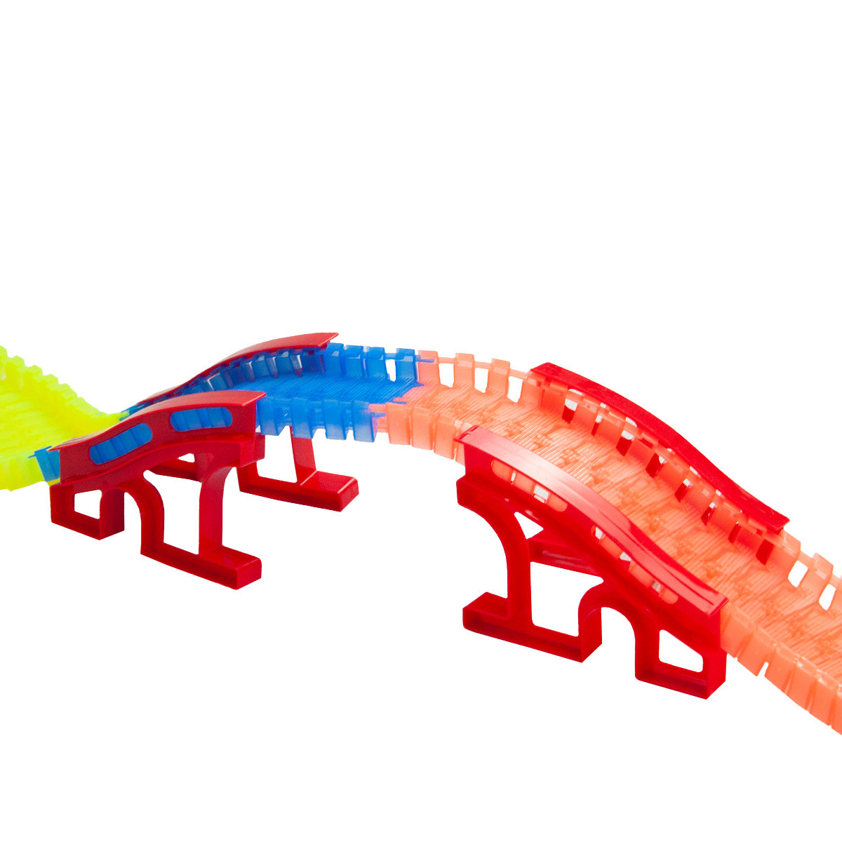 Světelná show ve tmě! Největší kouzlo přichází po zhasnutí světel – fluorescenční dráha začne zářit! Intenzitu osvětlení ovlivňuje doba vystavení světlu. Stačí dráhu umístit na slunce nebo pod lampu, aby se "nabila", a poté ji použít v temné místnosti.
