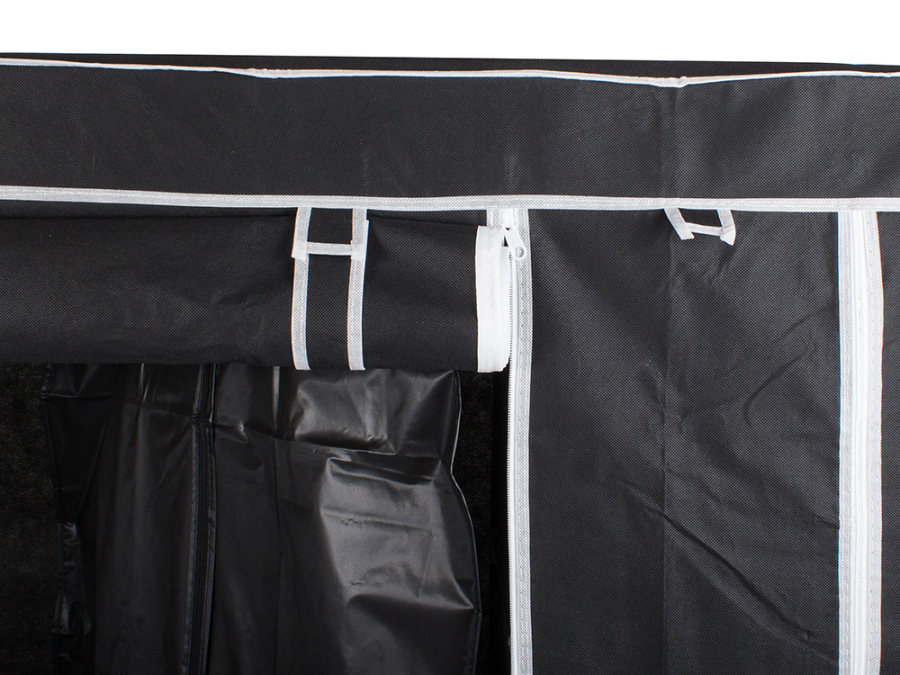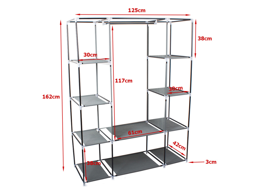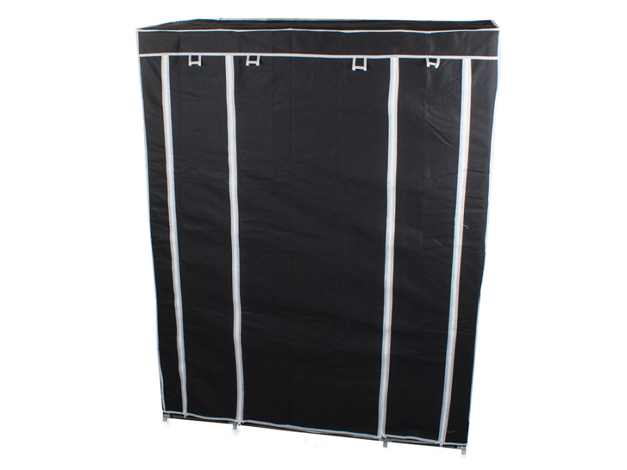Látková šatní skříň je ideálním řešením do ložnic namísto tradičních skříní, do šaten, pokojů a úložných prostor. Díky lehké konstrukci složené z trubek, rychlouzávěrů a tkaniny se rychle složí bez použití dalšího nářadí. Rám šatní skříně je potažen látkou, která se zapíná na patentky. Police jsou vyrobeny z voděodolného materiálu. Chrání naše oblečení před nečistotami, vlhkem a prachem. Skříň je vybavena 10 prostornými policemi a věšákem na pověšení prádla. Možnost vybení polic v libovolné kombinaci.