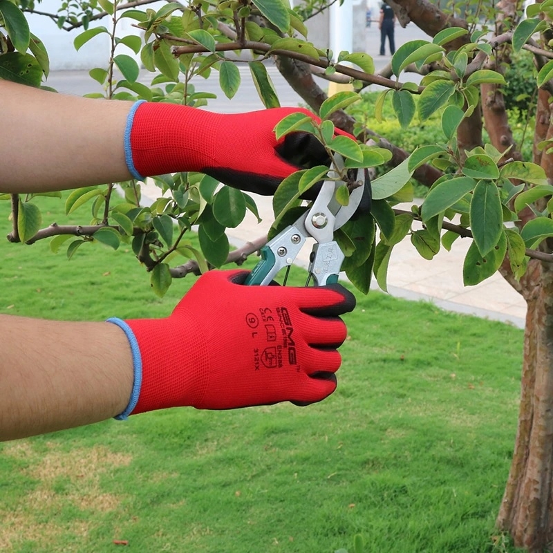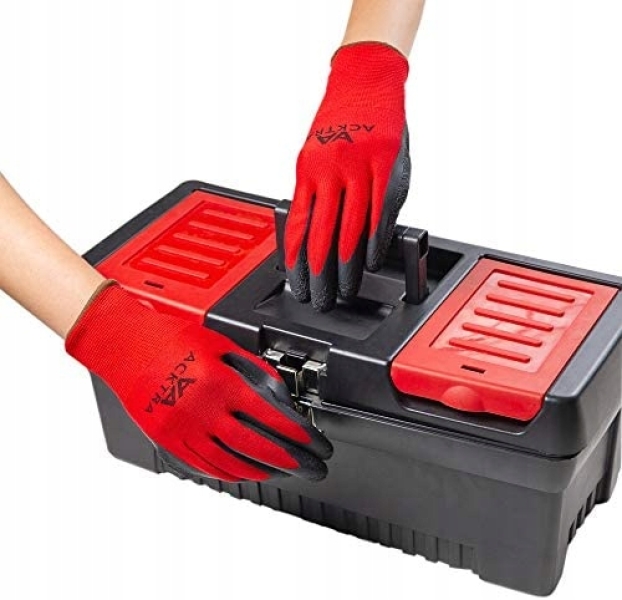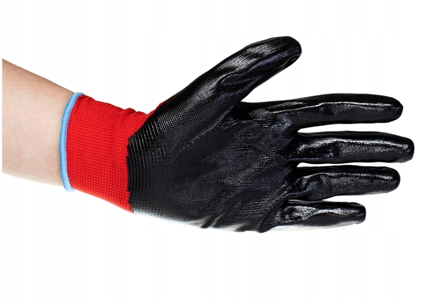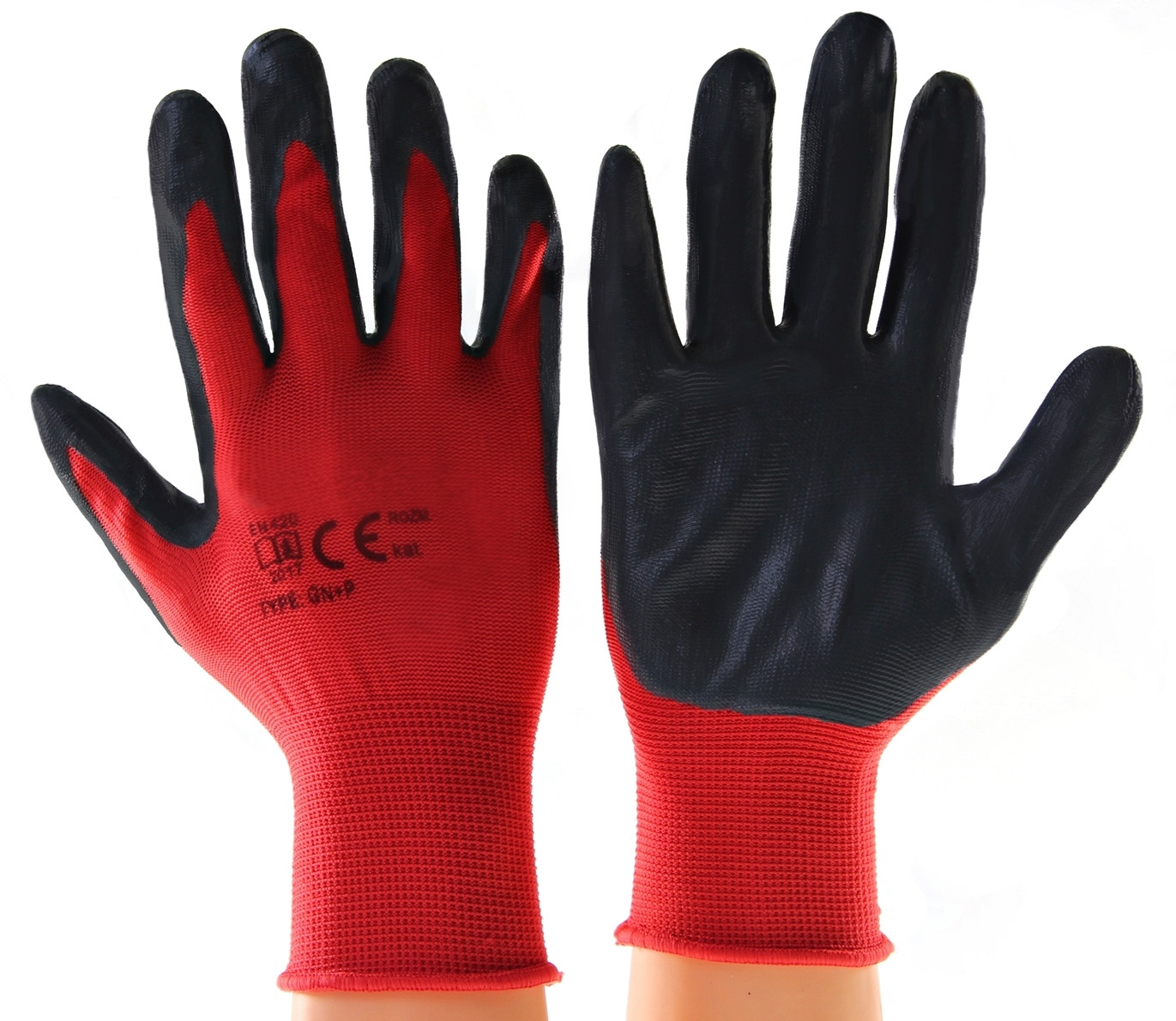 - Pracovní rukavice z nylonu v červené barvě, potažené černým nitrilem;
