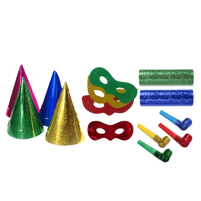 - 4 lesklé párty čepičky – barevné a třpytivé, skvělé pro malé i velké účastníky.