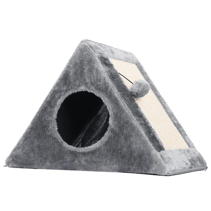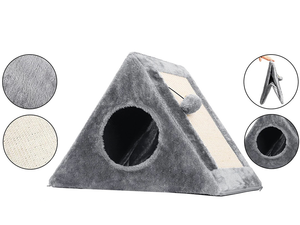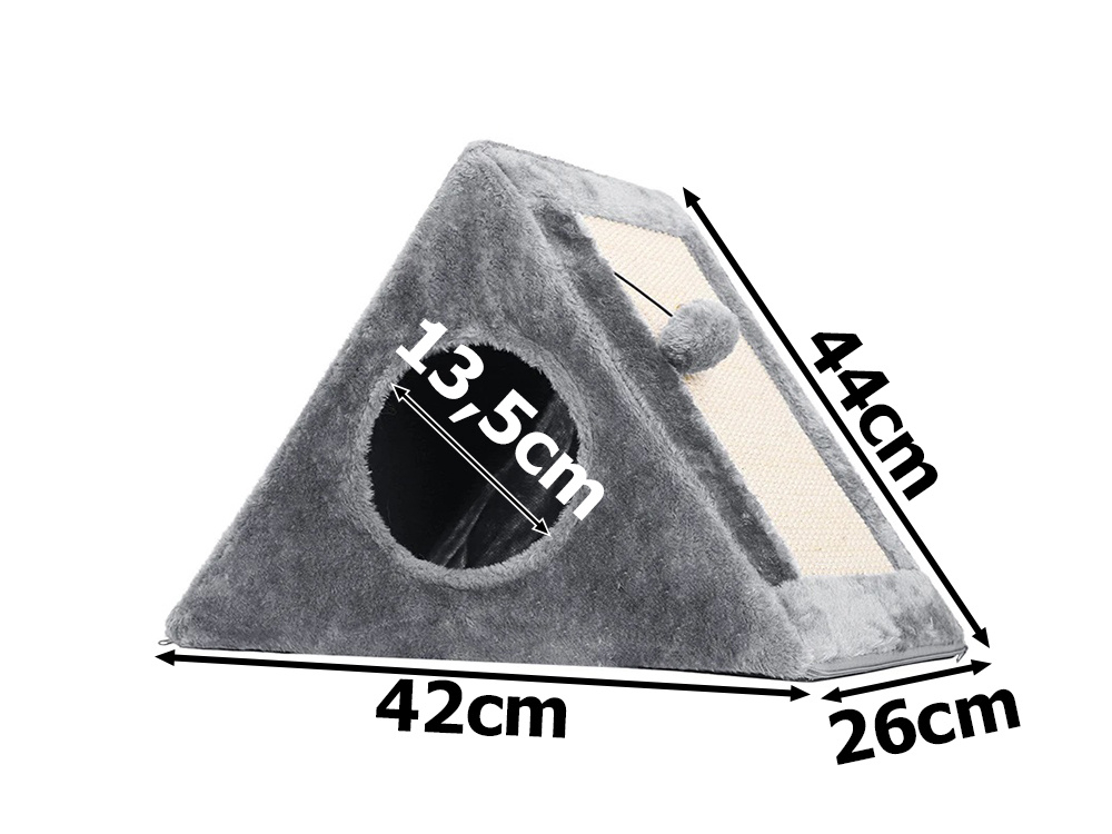 Škrabadlo je vyrobeno z vysoce kvalitních materiálů, které zajišťují odolnost a stabilitu. Pevná konstrukce ve tvaru trojúhelníku zaručuje, že vaše kočka bude moci volně škrábat, skákat a hrát si bez obav z převrácení.