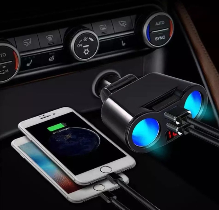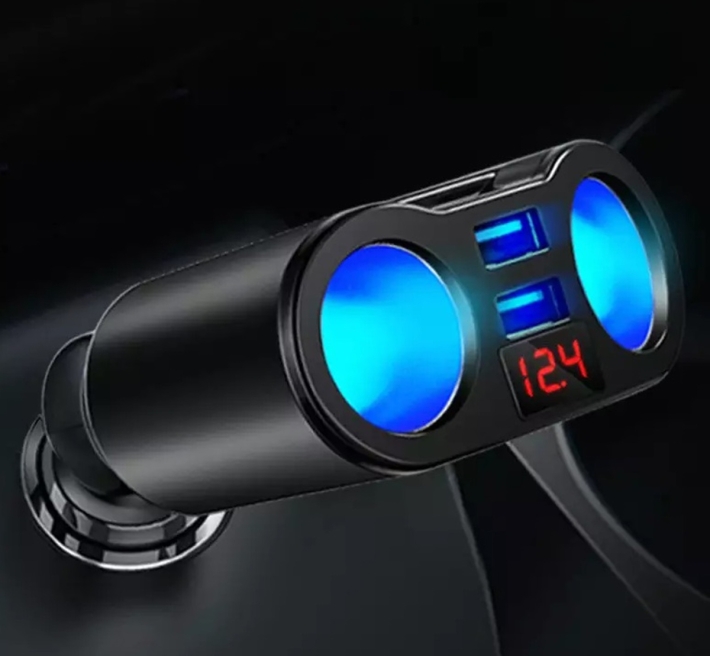 Rozbočovač zapalovače 12V pro dvě osvětlené zásuvky. Vybaven dvěma USB 5V porty a vestavěným voltmetrem. Ideální pro použití v autech, motocyklech, mopedech, čtyřkolkách a skútrech, jedním slovem, ve všech vozidlech, která mají 12V autozapalovač. Umožňuje použití dvou vestavěných USB portů s celkovým proudem 3,1A (2,1 + 1) a vestavěného voltmetru s displejem, umožňujícím aktuální měření napětí baterie.
