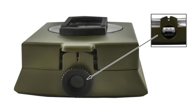 FOSFORIZOVÁNÍ - kroužek pod úhlovou stupnicí a šipka směřující k severu svítí ve tmě, což umožňuje používat kompas i v noci.